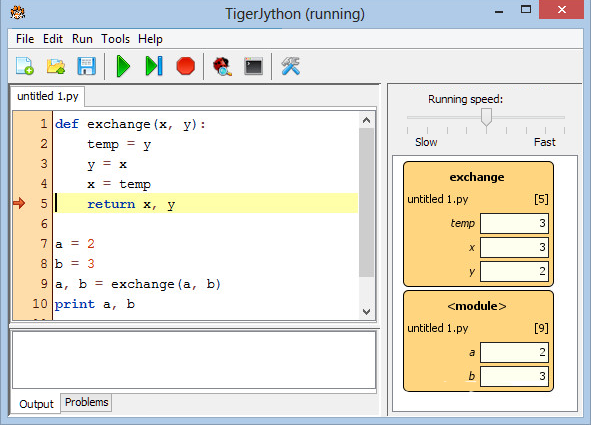 Debuggers are important tools for developing large program systems. You can run a program slowly with them, and even run it step by step. So to speak, the enormous execution speed of the computer is adjusted to the limited human cognitive ability. A confortable debugger is ncluded in TigerJython which can help you to better understand the program sequence in a correct program. You are now going to analyze the above defective program with the debugger.