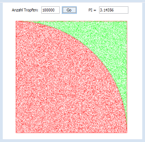 The GUI consists of two labels, two text boxes, and a button. Once created, you add them to GPanel with addComponent(). It should be clear that clicking on the OK button can be considered an event. The callback is registered via the parameter named actionListener in the constructor of JButton. Hopefully you remember that you should not execute lengthy code in a callback. So, you merely call wakeUp() in the callback, whereby the program, which was halted in the while loop using putSleep(), is awakened and then executes the simulation. from gpanel import * from random import random from javax.swing import * def actionCallback(e): wakeUp() def createGUI(): addComponent(lbl1) addComponent(tf1) addComponent(btn1) addComponent(lbl2) addComponent(tf2) validate() def init(): tf2.setText("") clear() move(0.5, 0.5) rectangle(1, 1) move(0, 0) arc(1, 0, 90) def doIt(n): hits = 0 for i in range(n): zx = random() zy = random() if zx * zx + zy * zy < 1: hits = hits + 1 setColor("red") else: setColor("green") point(zx, zy) return hits lbl1 = JLabel("Number of drops: ") lbl2 = JLabel(" PI = ") tf1 = JTextField(6) tf2 = JTextField(10) btn1 = JButton("OK", actionListener = actionCallback) makeGPanel("Monte Carlo Simulation", -0.1, 1.1, -0.1, 1.1) createGUI() tf1.setText("10000") init() while True: putSleep() init() n = int(tf1.getText()) k = doIt(n) pi = 4 * k / n tf2.setText(str(pi)) |